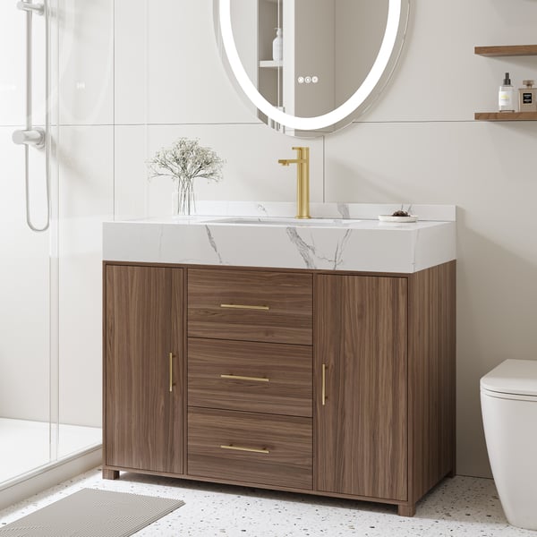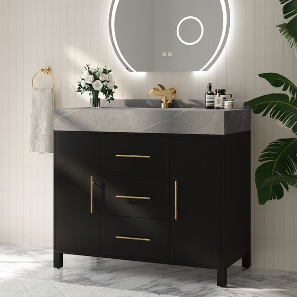 Vanité de salle de bain autoportante noire de 1000 mm, comptoir en pierre frittée et poignées dorées